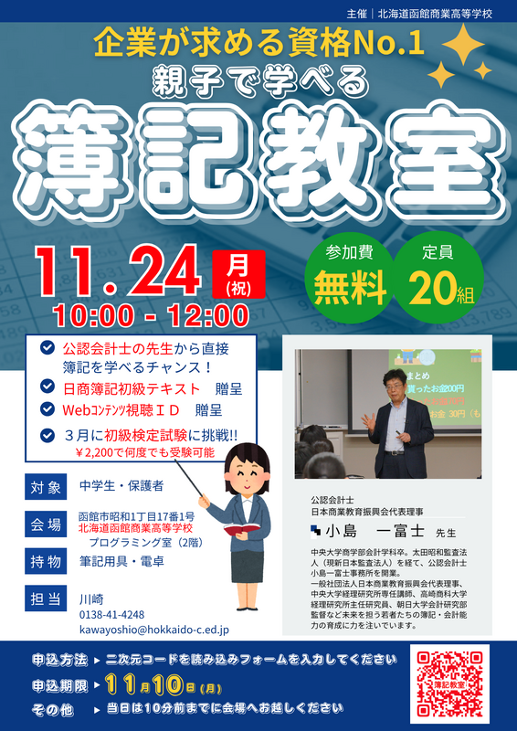 このたび本校において中学生とその保護者の方々を対象に「親子で学べる簿記教室」を開催することとなりました。新学習指導要領の中学社会(公民的分野)に「企業会計」や「会計情報の提供や活用」に関する記述が追加されるなど、簿記会計に関する知識や技術の習得が重要視されるようになってきていることから、より多くの中学生に「簿記」が社会の中でどのような役割を果たしているのかを知ってもらう機会になればと思い、企画いたしました。是非ご参加ください。