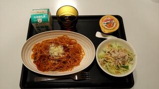 スパゲティナポリタン、チキンサラダ、ミカンゼリー、牛乳でした。
