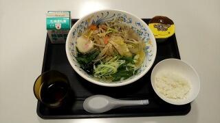 塩野菜ラーメン、小ライス、カスタードプリン、牛乳でした。