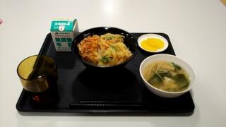 野菜天丼(かき揚げ丼)、ワカメのみそ汁、たくあん、牛乳でした。